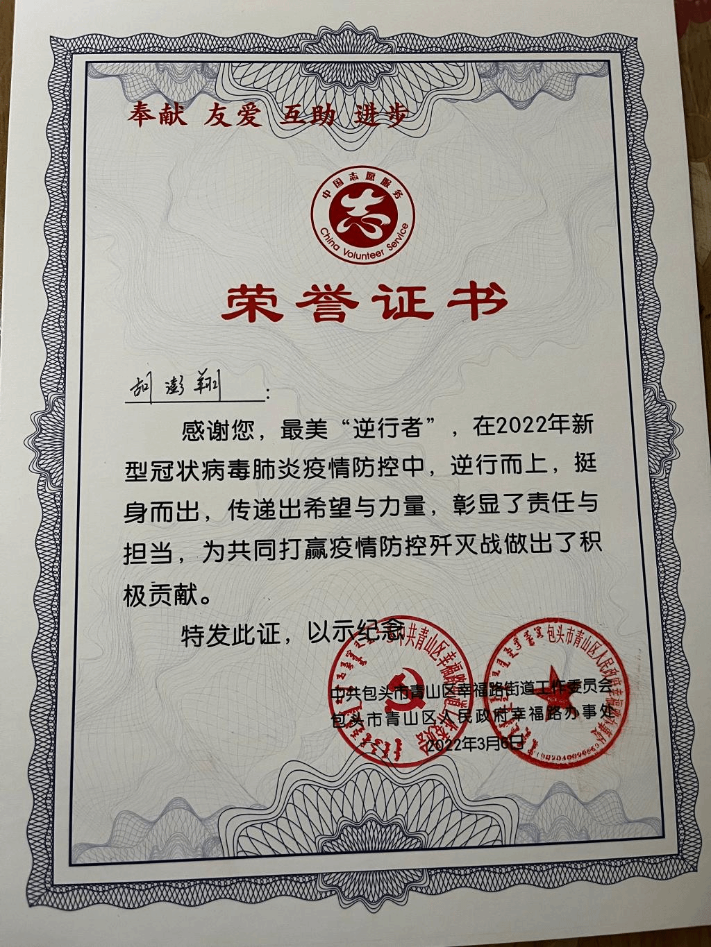 为响应公司党委关于扛起疫情防控使命担当的号召,PA视讯集团官网研究生党支部全体党员同志充分发挥党员先锋模范作用,聆听身边群众所需,校内党员主动承担楼宇疫情防控志愿服务工作,积极帮助未返校同学寄送行李、查找材料、办理校内事务,从身边小事彰显党员服务奉献精神。校外党员服从所在地疫情防控要求,响应社区防控工作号召,担任社区疫情防控志愿者,为社会面疫情防控工作贡献自己的力量。其中,来自PA视讯集团官网电子信息研究生党支部的胡澎翔同志在疫情期间主动担任内蒙古包头市青山区幸福路街道志愿者,负责当地居民的日常核酸检测任务。胡澎翔同志穿着厚重的防护服,每天清晨挨家挨户提醒小区居民做核酸,核酸检测开始后,他还需要维持队伍秩序,减少检测队伍混乱现象。而对于部分为重复核酸检测工作感到烦躁或不理解的居民,他则一遍遍耐心地向他们解释核酸检测工作的必要性,以取得居民群众的理解和配合;对小区里行动不便的老年人,胡澎翔同志则发挥自己对小区环境更为熟悉的优势,带领医护人员上门进行核酸检测,每天穿着厚重的防护服多次上下楼,即使每天的志愿服务工作强度高、困难多,他也咬牙坚持,甘心奉献,积极担任社区志愿者,直到社区恢复正常社会生活。胡澎翔同志的付出也得到当地部门的肯定,彰显了信院学子不畏困难勇担当的风采。