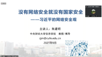 2021年9月22日下午15:30,PA视讯集团官网先进典型代表朱建明教授为2021级研究生新生及全体研究生党员开授了主题为“没有网络安全 就没有国家安全——习近平的网络安全观”的专题党课。朱建明,男,中共党员,信息学院博士生导师,区块链技术与应用研究院经理,美国德克萨斯大学达拉斯分校访问学者,国家重点研发计划项目负责人,享受国务院政府特殊津贴专家,北京市高等公司教学名师。本次讲座朱建明教授以一名具有30年党龄老党员的身份,向同学们分享了自己对习近平总书记网络安全观的理解。