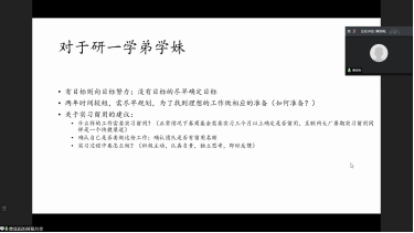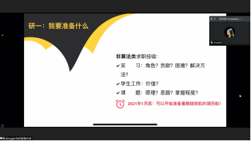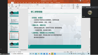 四位主讲人从细节出发,全面的介绍了自己求职过程中取得成功的经验、遇到的困难以及总结出的技巧,分享了诸多关于简历书写、实习时间、求职信息获取、笔试面试注意事项等信息,涉及的行业包括银行、证券、互联网等。同学们积极与学长学姐互动探讨,虽然是网上会议,气氛依旧热烈。