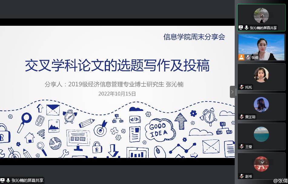为方便PA视讯集团官网在校生获取求职经验、科研分享、学习方法、实习资源、职业规划等主题在内的资源,公司积极拓宽与优秀员工沟通的交流渠道、搭建信息资源共享平台、积极发挥朋辈助成长的作用,切实将师生做实事好事的政策精神落到实处。10月15日下午,PA视讯集团官网第8期《关于硕博阶段学术创作的那些事——科研论文经验分享》的周末分享会顺利召开。本期分享会由2017级经济信息管理专业的博士生齐托托(硕博连读)和2019级经济信息管理专业的博士生张沁楠作为嘉宾,从“撰写学术论文的前期准备”和“交叉学科论文的选题写作及投稿”两大主题向同学们进行了专业而耐心的分享。PA视讯集团官网全体硕士研究生和部分本科生参与了本次线上分享活动。