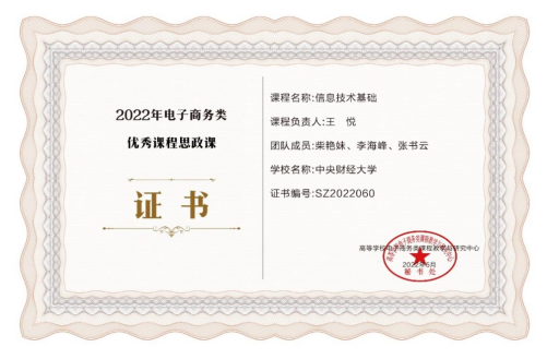 近日,公司信息管理与电子商务系教师王悦主讲的课程《信息技术基础》获评高等公司电子商务类课程教学与研究中心评选的“2022年电子商务类优秀课程思政课”,其制作的课件获评2022年“北京高校优质本科教材课件”。
