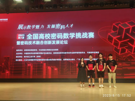 8月15日,第八届(2023年)全国高校密码数学挑战赛在深圳落下帷幕。公司2021级信息安全专业孙桐、张涛、许康杰三位本科生组成的参赛团队“日昇昌队”,在指导老师王卯宁的带领下参加了比赛。团队对题目“对称密码算法的量子电路构造”给出了解决方案,经历初赛和决赛的激烈角逐,最终荣获全国三等奖。