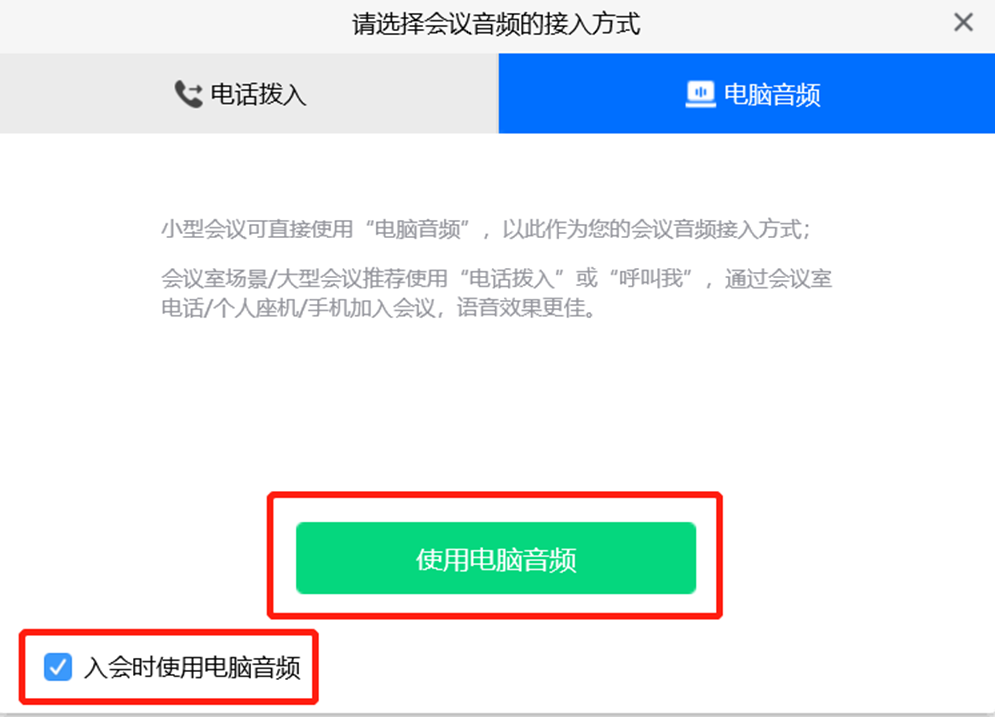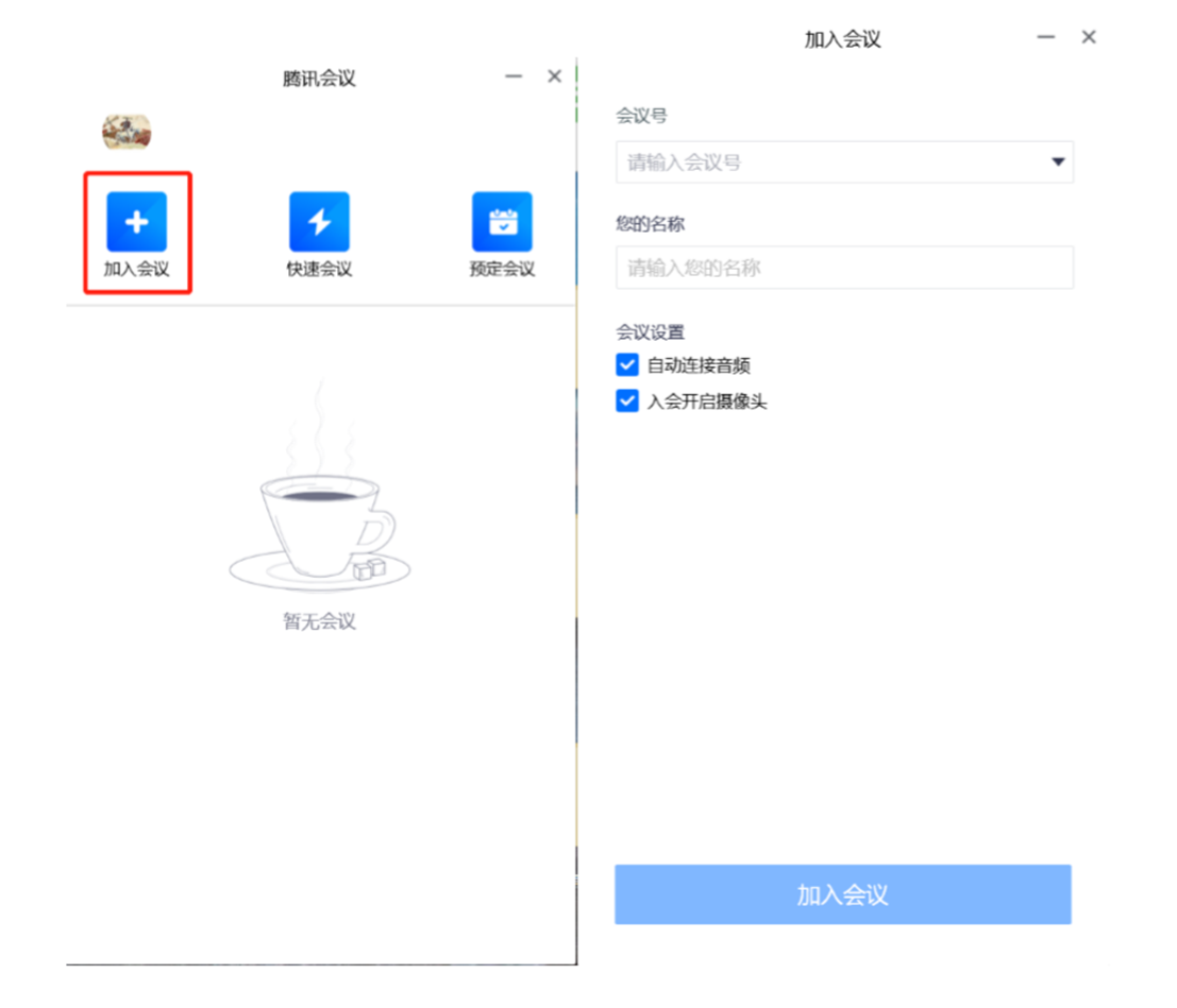 每名考生需预先在两个设备(主机位和辅机位)上分别注册腾讯会议账号和钉钉账号,通过会议号与入会密码(会通过邮件和短信发给各位同学)→点击“加入会议”→填写“会议号”、“您的名称”(设置为复试序号+姓名,序号在23日预演的时候确定),勾选“自动连接音频”“入会开启摄像头”→点击“加入会议”→勾选“入会时使用电脑音频”,点击“使用电脑音频”。
