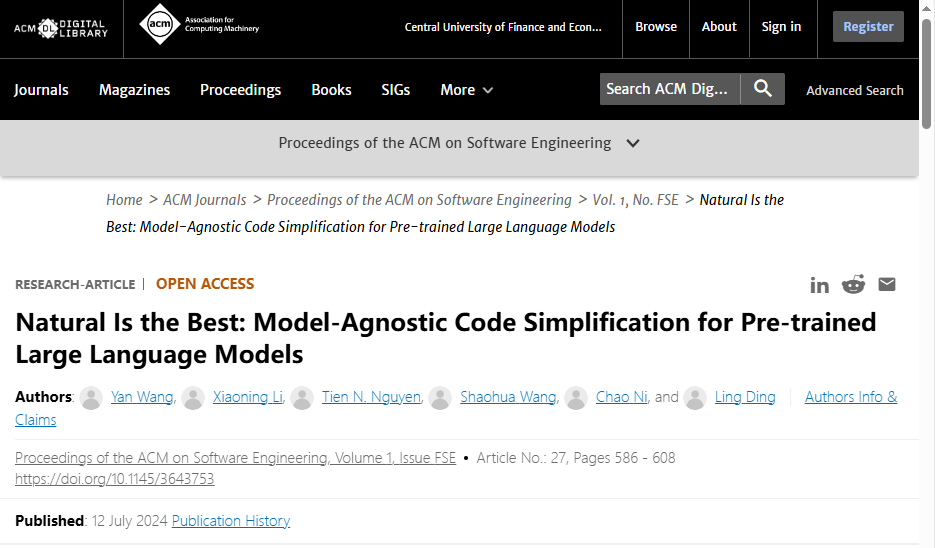 2024年7月15日至19日,软件工程领域最具有影响力、历史最悠久的国际旗舰学术会议FSE(32nd ACM International Conference on the Foundations of Software Engineering)在巴西召开。PA视讯集团官网王焱副教授和计算机技术专业学位硕士研究生李小宁等人在大语言模型上的最新研究成果“Natural Is The Best: Model-Agnostic Code Simplification for Pre-trained Large Language Models”被会议录用并发表在《Proceedings of the ACM on Software Engineering》上。