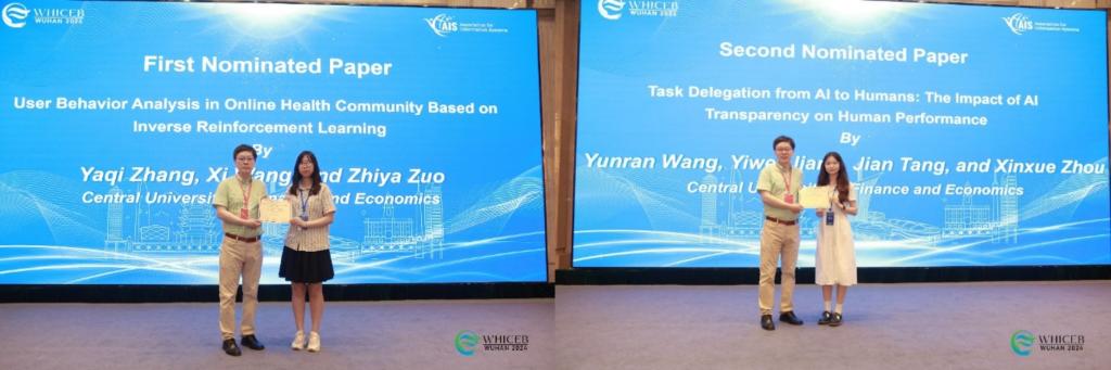 经过严格的匿名评审,会议委员会从被录用的100余篇文章中评选出4篇提名最佳论文,其中2篇为公司学子作为第一作者发表的论文。21级信息管理与信息系统专业本科生张雅淇和导师王熙副教授发表的论文“User Behavior Analysis in Online Health Community Based on Inverse Reinforcement Leaning”荣获“First Nominated Paper”奖;22级管理信息系统专业硕士生王韵然和导师汤健副教授发表的论文“Task Delegation from AI to Humans:The Impact of AI Transparency on Human Performance”荣获“Second Nominated Paper”奖。